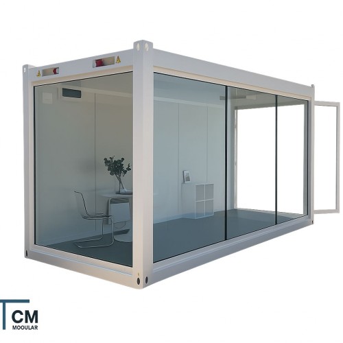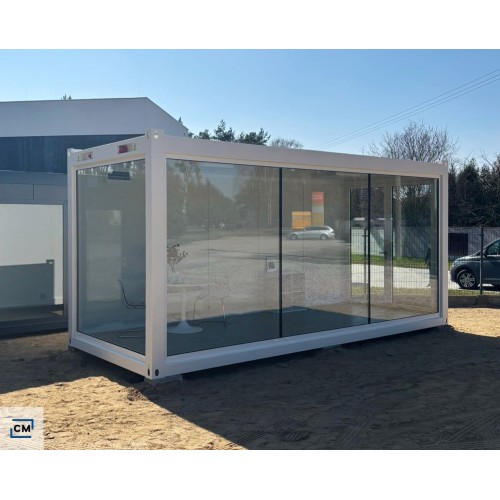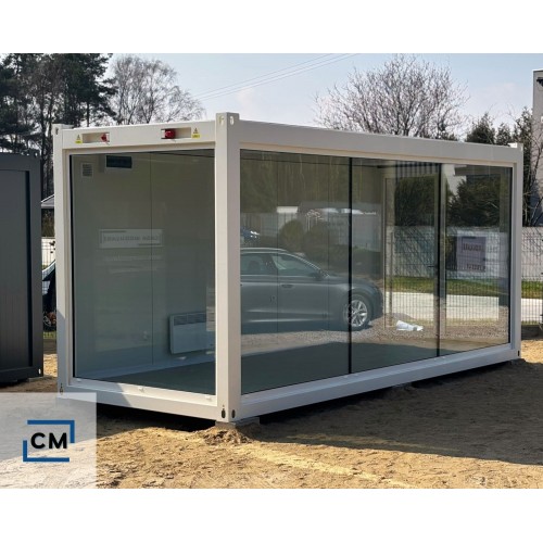 Kontener świetnie sprawdza się jako stoisko targowe, showroom, punkt promocyjny, biuro obsługi klienta lub mobilny pawilon sprzedażowy. Modułowa konstrukcja pozwala na szybki montaż i łatwą adaptację do wymagań konkretnego projektu.